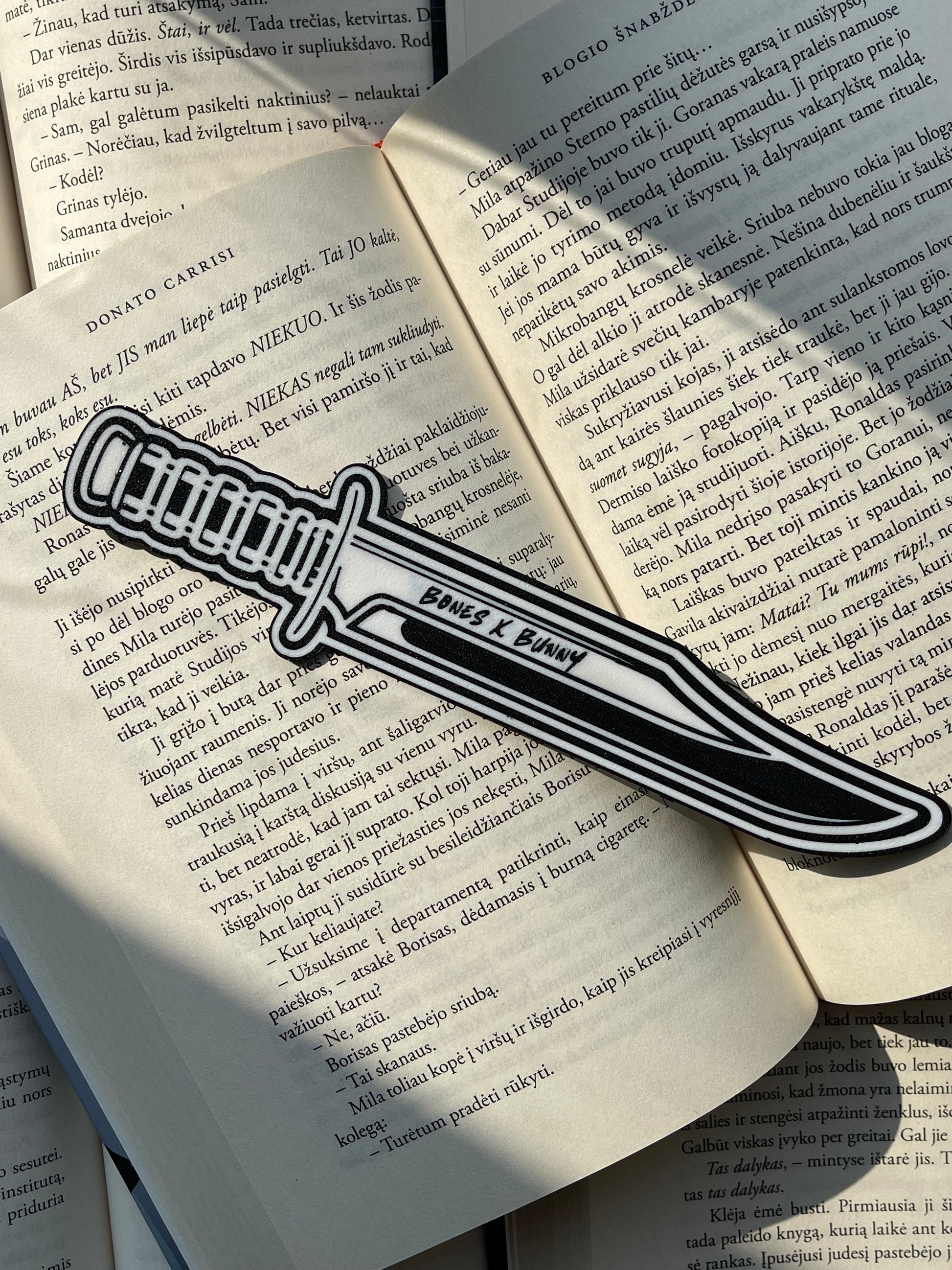 Išraiškingas knygos skirtukas, įkvėptas Palik mane autorės K. Moronova. Durklo formos dizainas su užrašu Bones & Bunny perteikia tamsią, emocijų kupiną istorijos atmosferą.