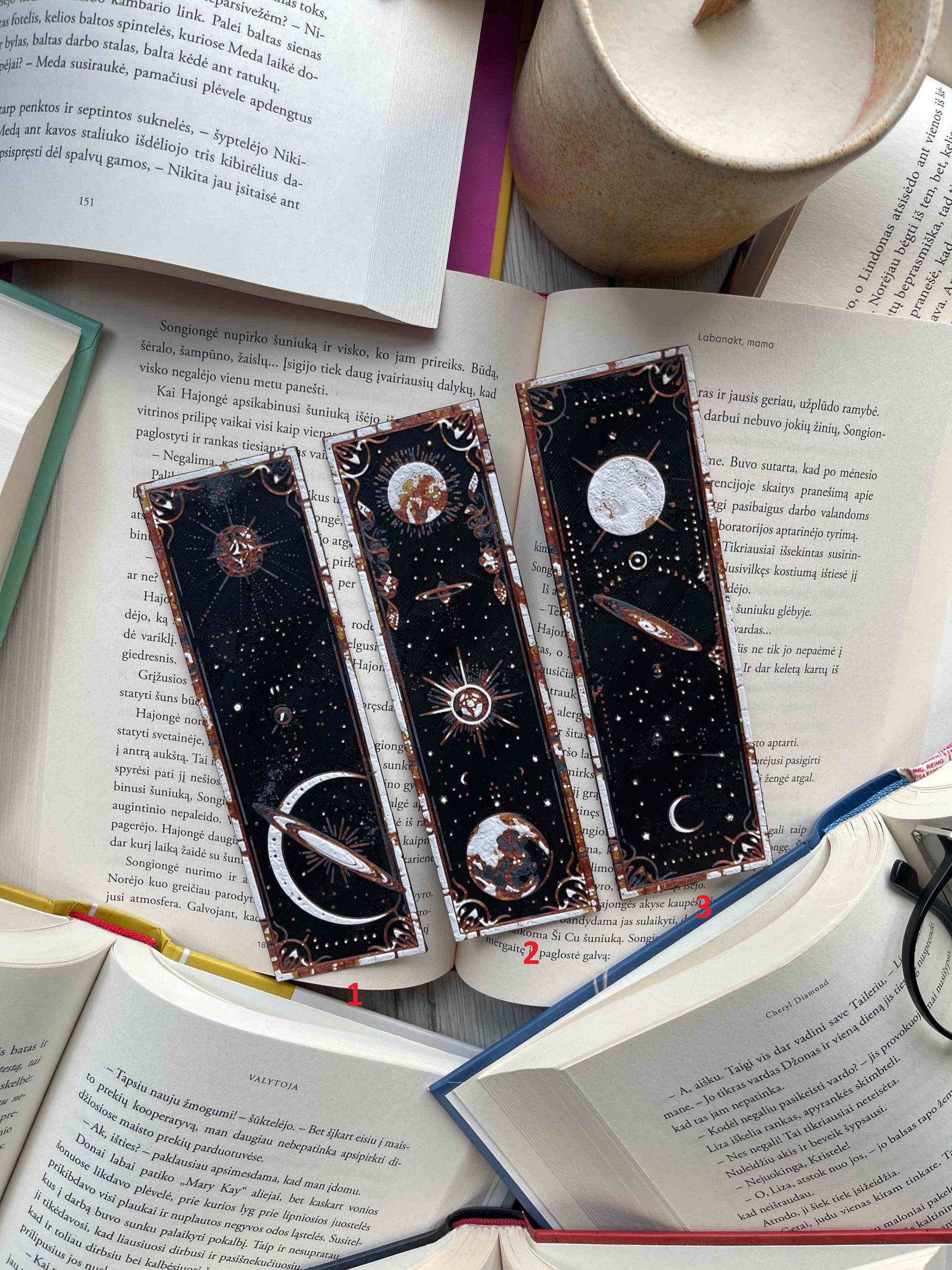 Kosmoso įkvėptas skirtukas su planetų, žvaigždžių ir galaktikų motyvais. Lengvas, patvarus ir elegantiškas – žvaigždiškas palydovas jūsų skaitymui.