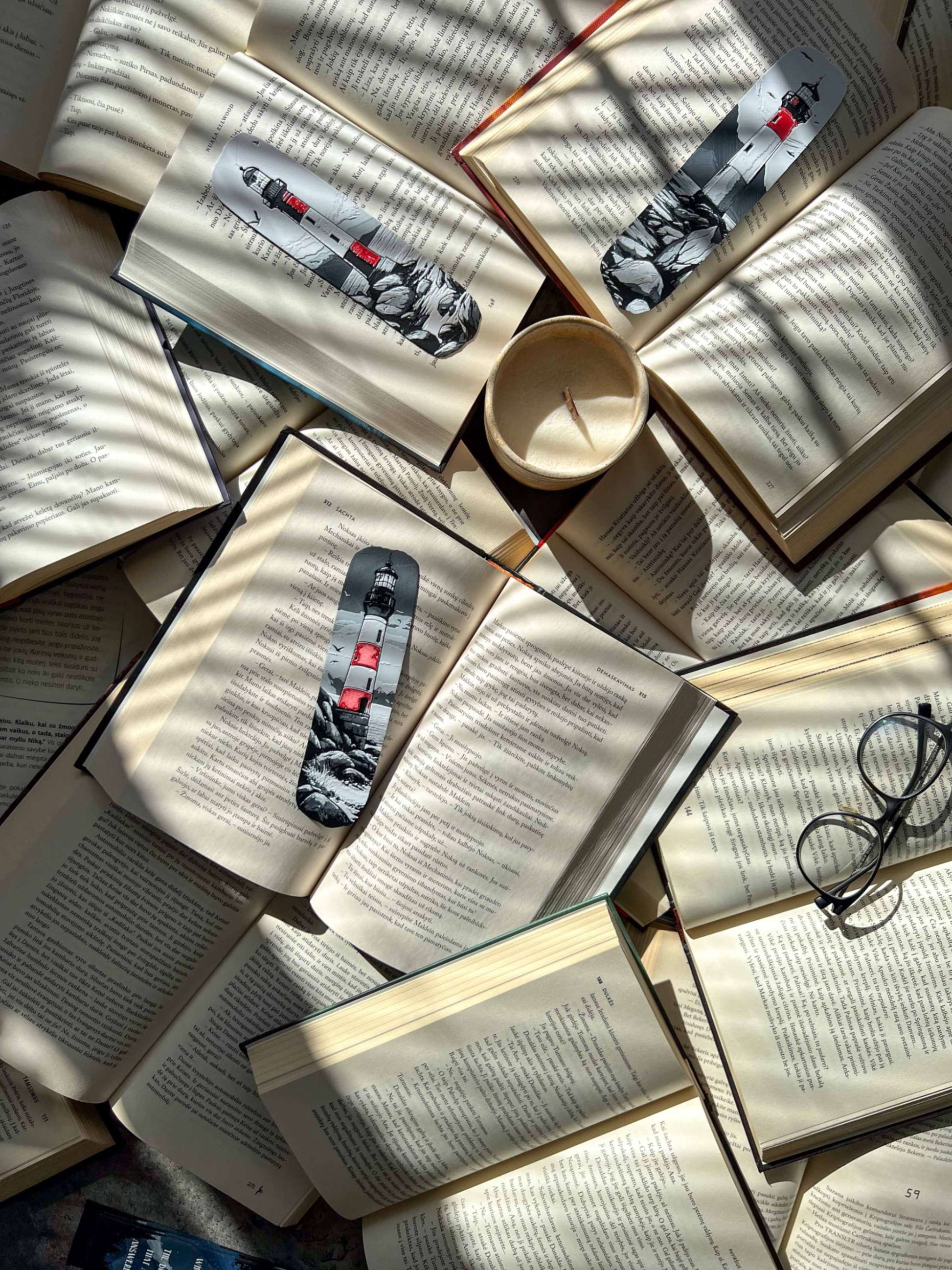 Jūrinės tematikos skirtukas su išraiškingais švyturio motyvais. Lengvas, patvarus ir atmosferiškas – puikiai tinka jūros ir istorijų mylėtojams.