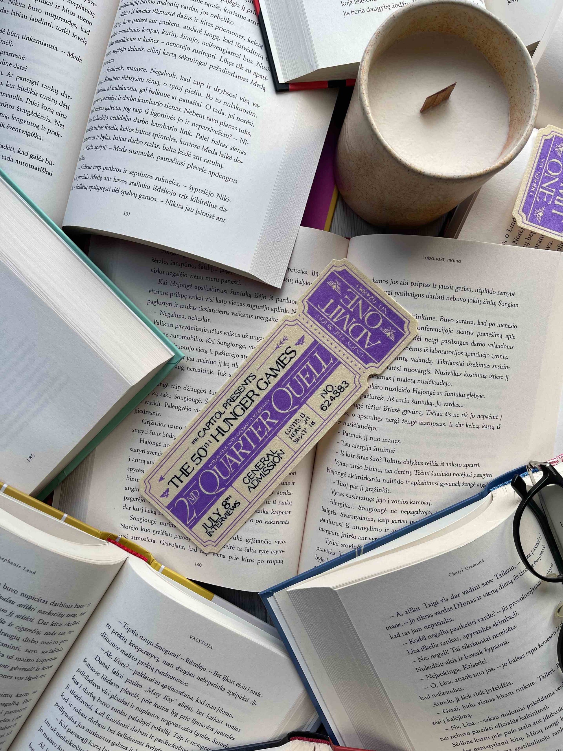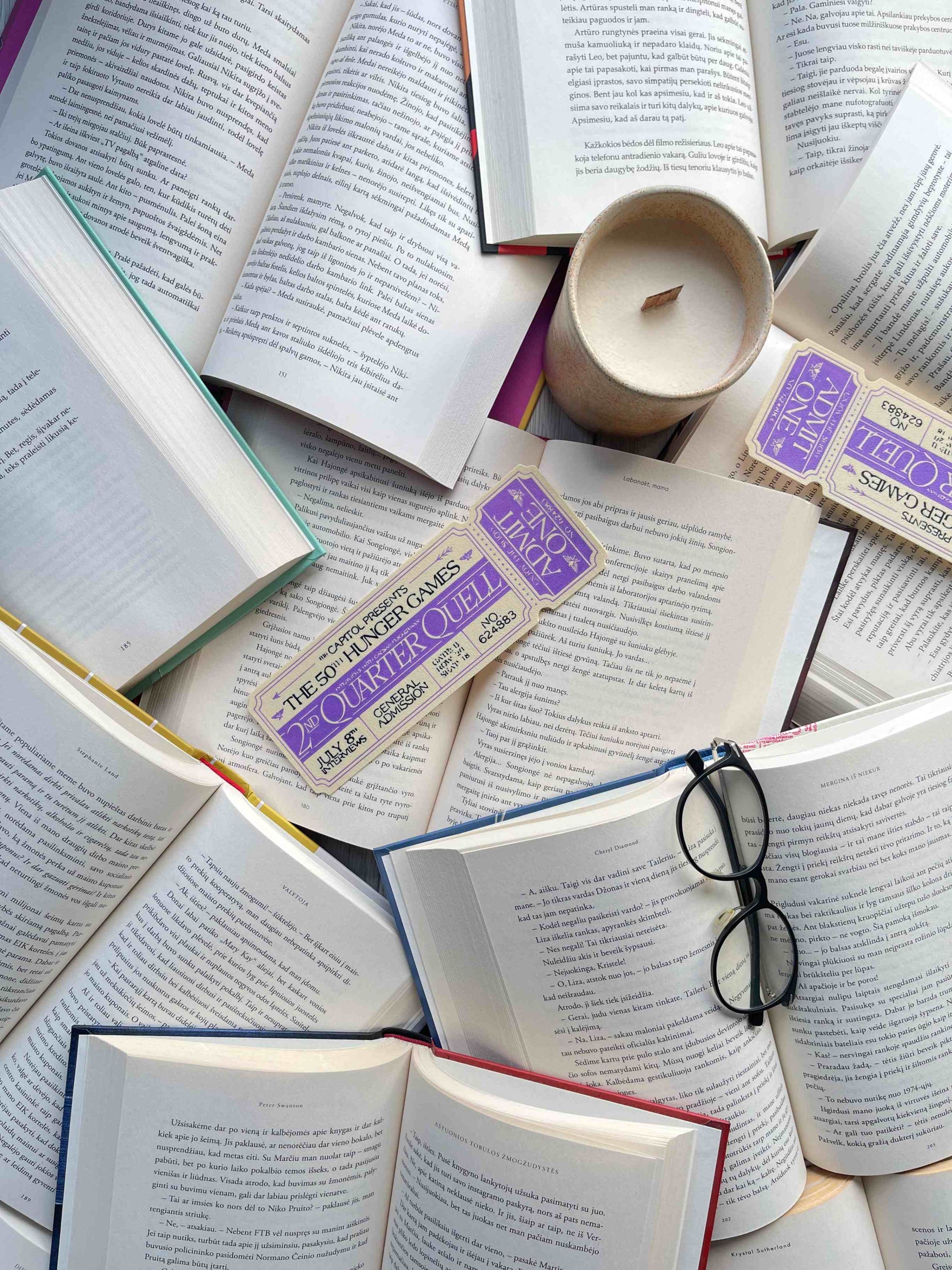 Skirtukas, įkvėptas „Bado žaidynių“ pasaulio. Lengvas, patvarus ir stilingas – unikalus aksesuaras jūsų knygoms.