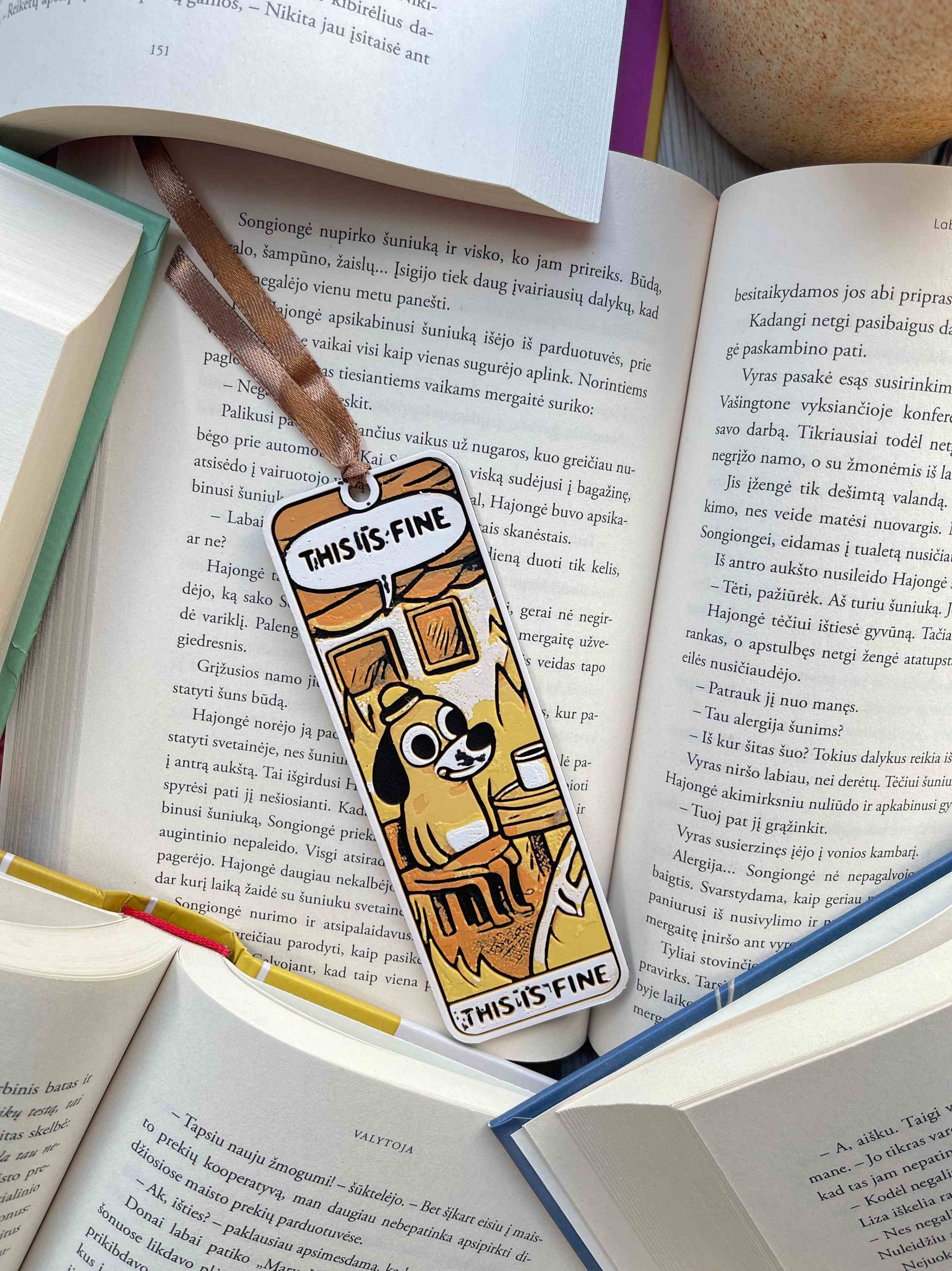 Humoristinis ir ikoniškas skirtukas su garsiuoju „This is Fine“ šunimi. Lengvas, patvarus ir linksmas – puiki dovana knygų mylėtojams, turintiems humoro jausmą.