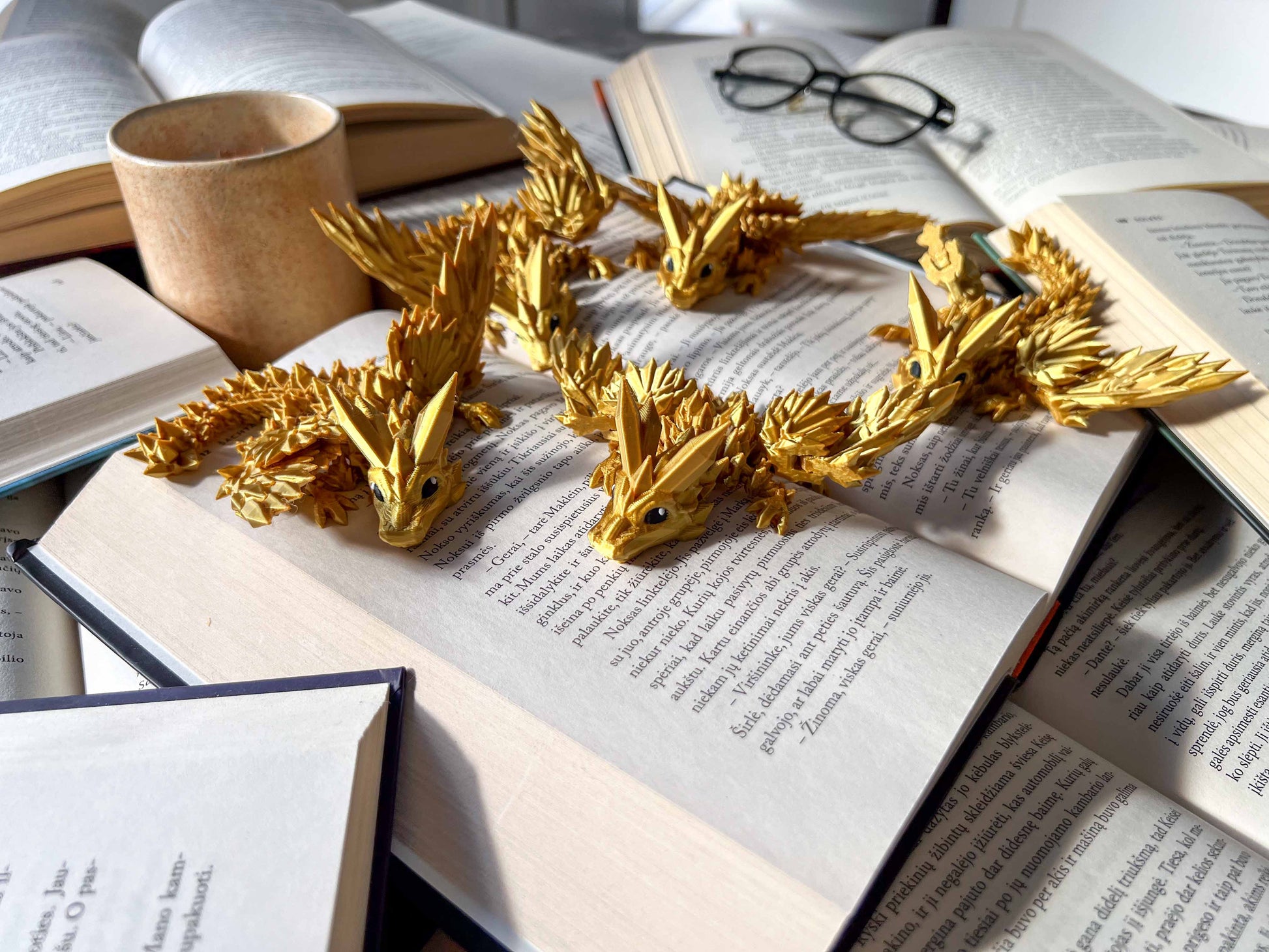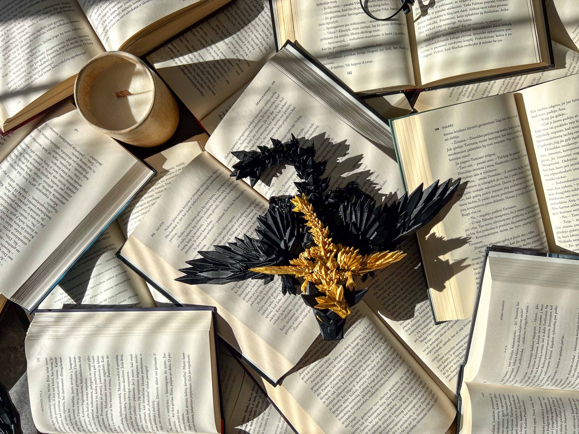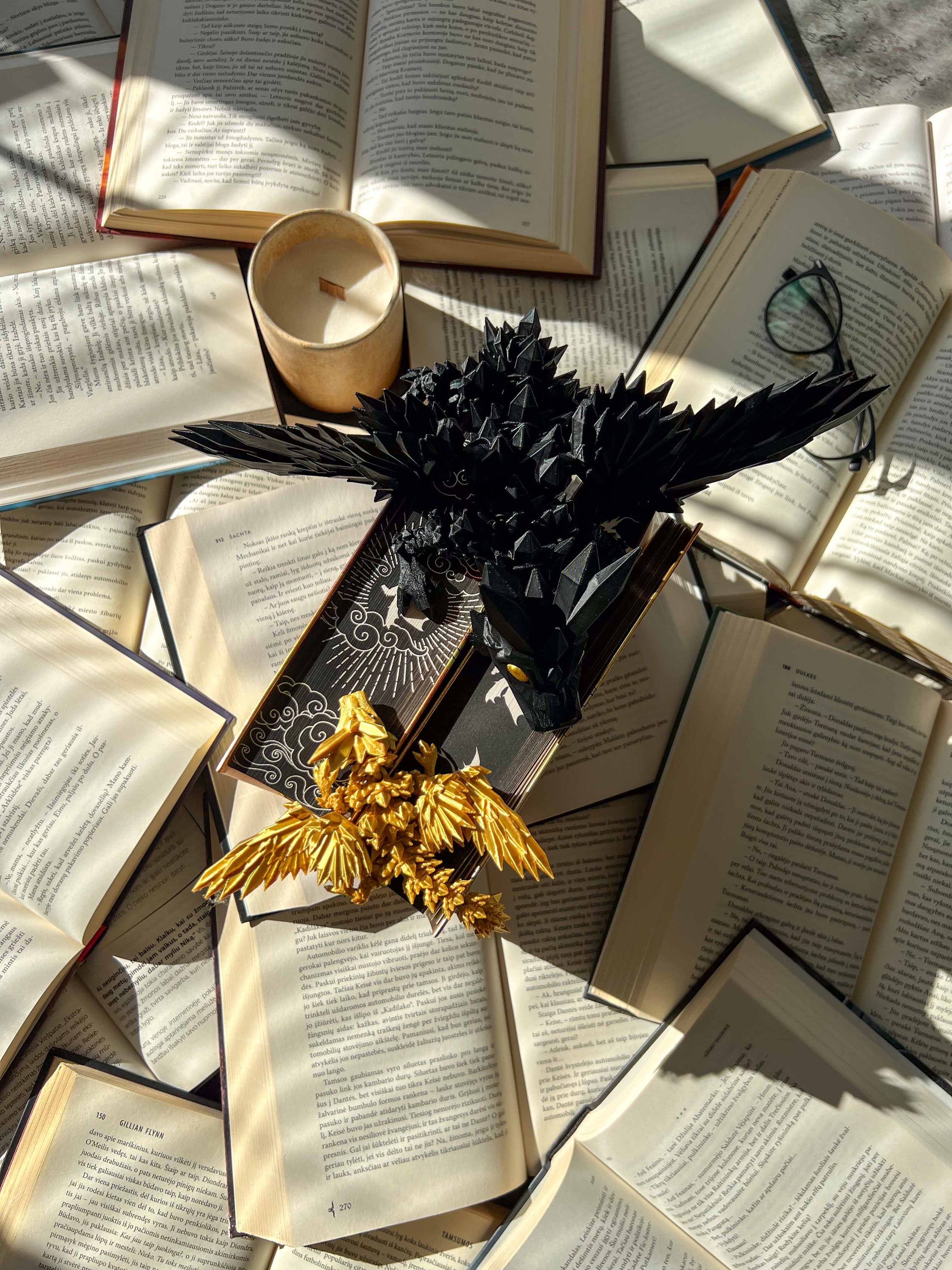 Įspūdingų lanksčių drakonų figūrėlių pora, įkvėpta „Fourth Wing“. Rinkinyje – auksinis ir juodas drakonas, puikiai tinkantys fantastikos mylėtojams ir kolekcionieriams.